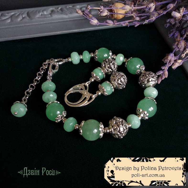 Матеріали: намистини натурального каміння Нефриту 2-х видів, а також металічні намистини та фурнітура срібного кольору – біжутерний сплав.