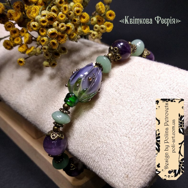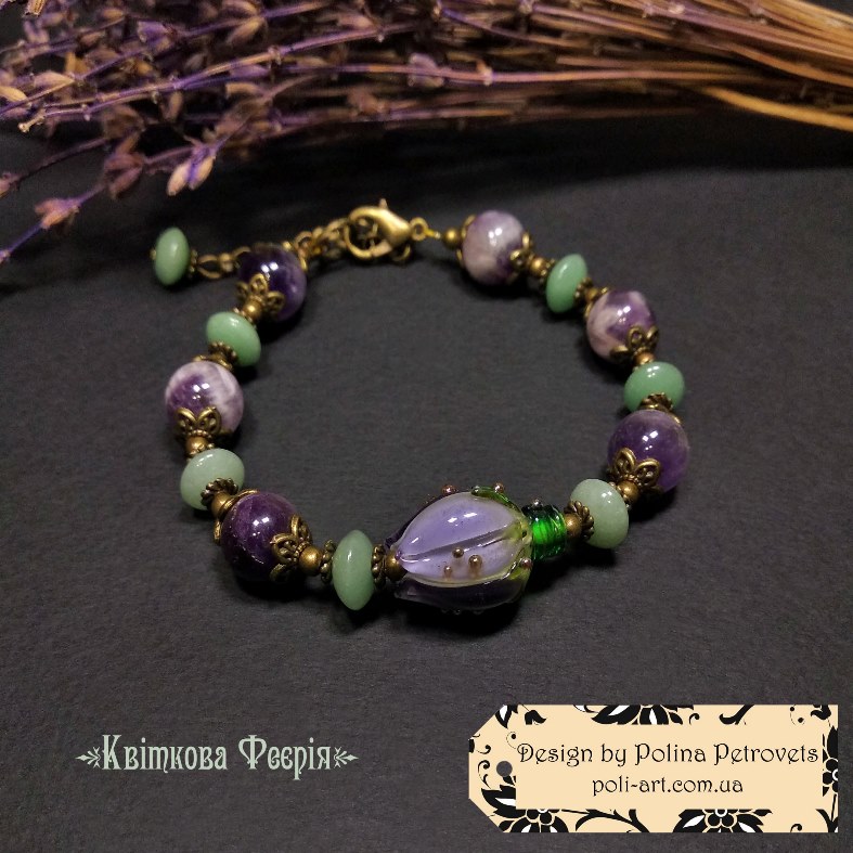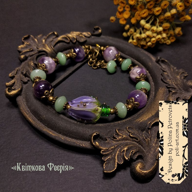 Introduction » За видами подарунків / виробів » Авторські прикраси » Браслет з аметисту, нефриту та лемпворку "Квіткова Феєрія" (тон: бронза)
