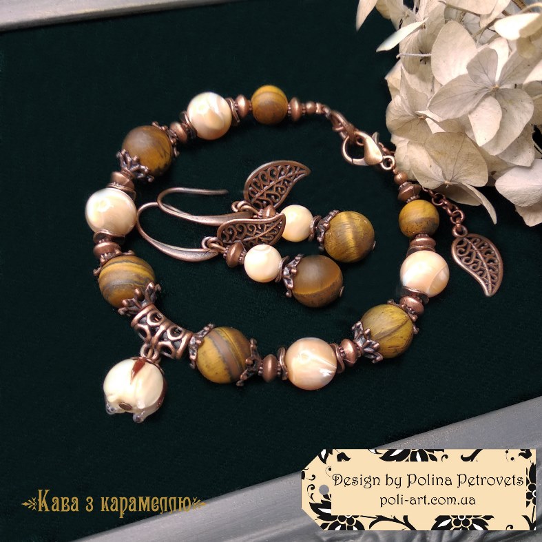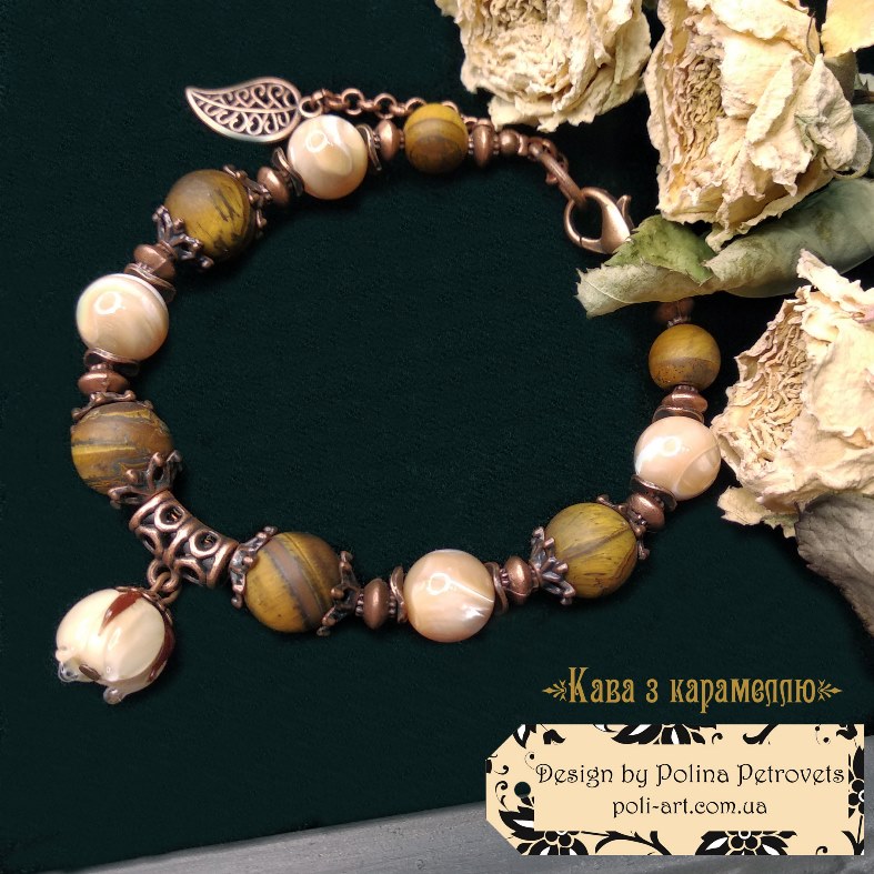 Introduction » За видами подарунків / виробів » Авторські прикраси » Браслет з баламутами, тигровим оком та лемпворком "Кава з Карамеллю"