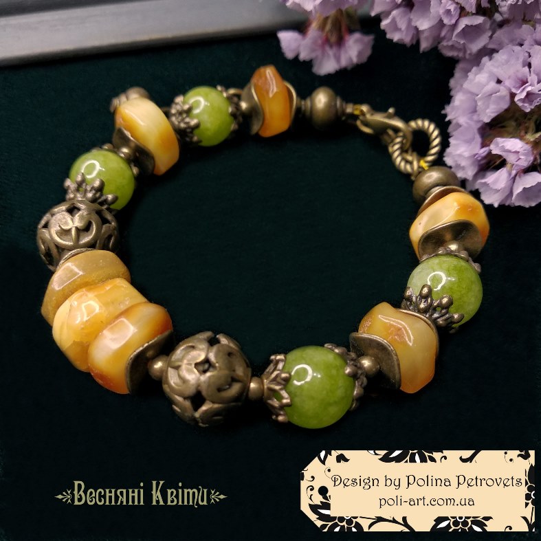 Introduction » За видами подарунків / виробів » Авторські прикраси » Браслет з бурштином і жадеїтом "Весняні Квіти"