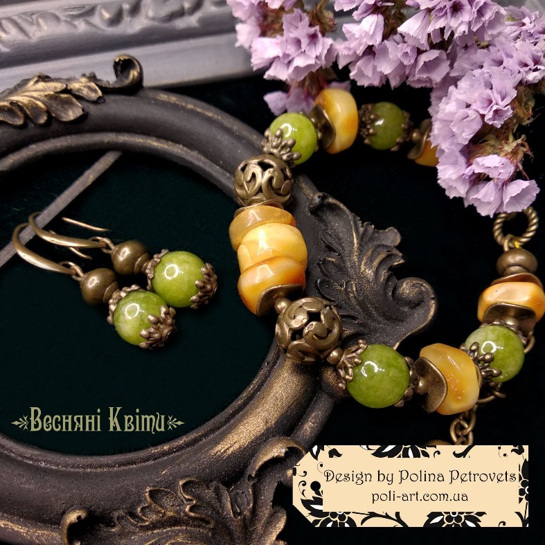 Матеріали: намистини натурального каміння Бурштину і Жадеїту, а також металеві намистини, обіймачі та фурнітура бронзового кольору - біжутерний сплав.