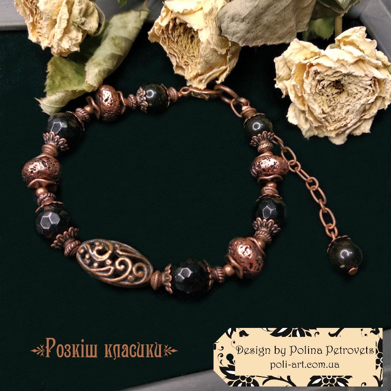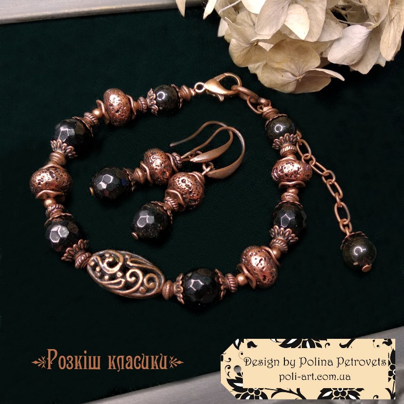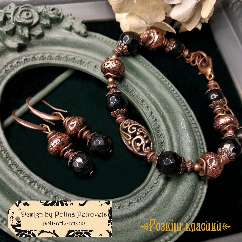 Матеріали: намистини натурального каміння гальванізованої Лави і чорного Оніксу, а також металеві намистини, обіймачі та фурнітура мідного кольору - біжутерний сплав.