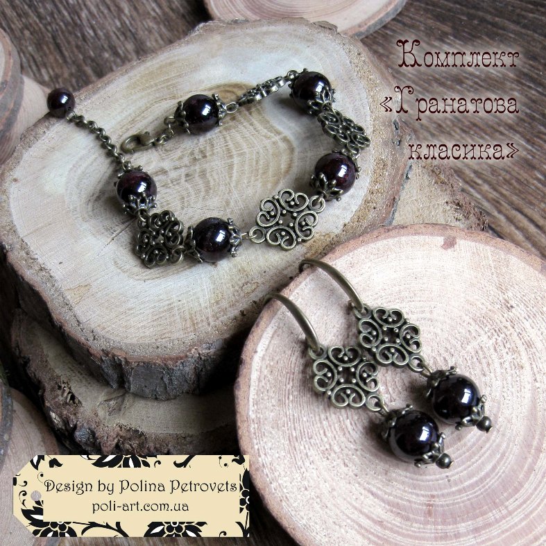 Склад: намистини натурального каміння гранату, а також намистини і фурнітура бронзового кольору (біжутерний сплав).