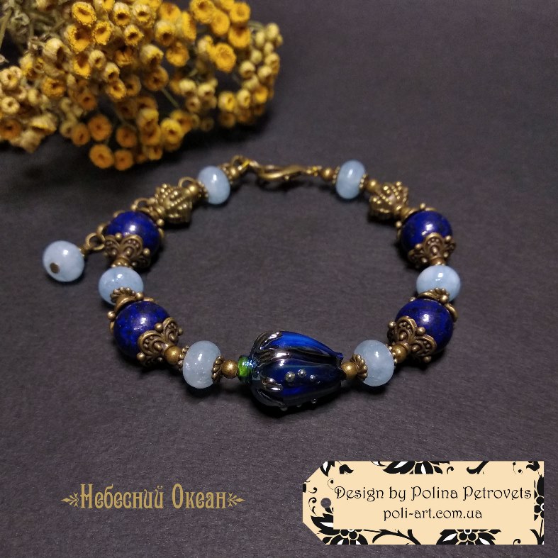 Introduction » За видами подарунків / виробів » Авторські прикраси » Браслет з лазуритом, аквамарином та лемпворком "Небесний Океан"