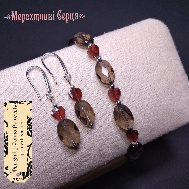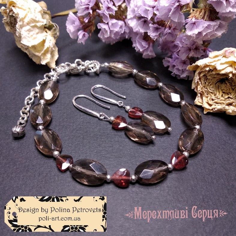 Introduction » За видами подарунків / виробів » Авторські прикраси » Браслет з раухтопазом і гранатом "Мерехтливі Серця"