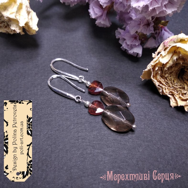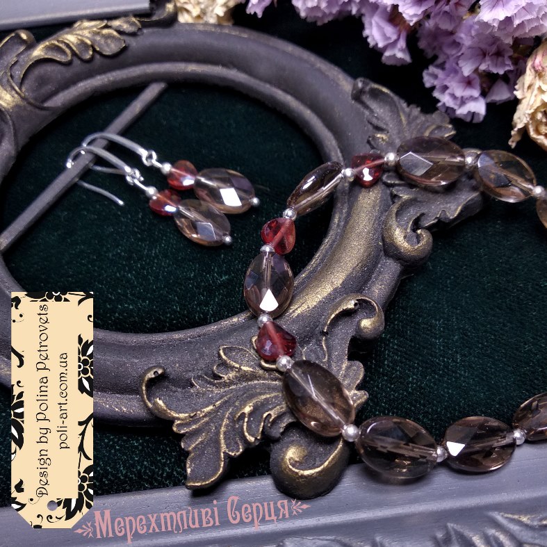 Матеріали: намистини натурального каміння Раухтопазу та Гранату, а також металічні намистини і фурнітура срібного кольору – біжутерний сплав.