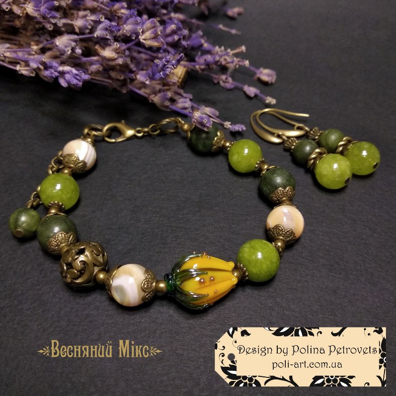 Introduction » За видами подарунків / виробів » Авторські прикраси » Браслет з жадом, нефритом, баламутами та лемпворком "Весняний Мікс"