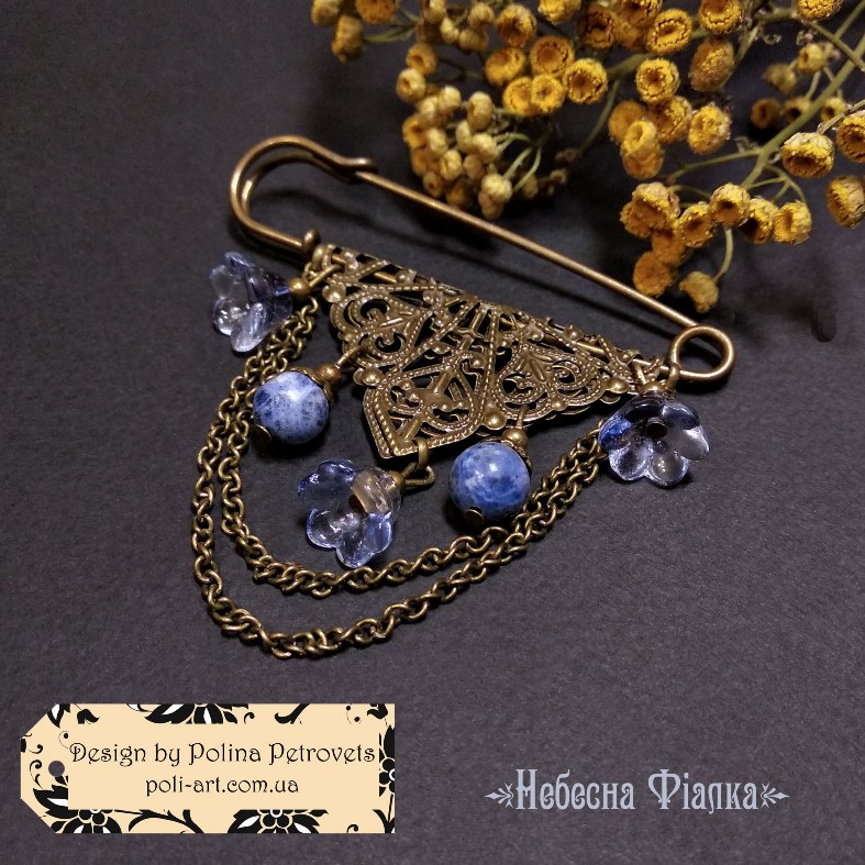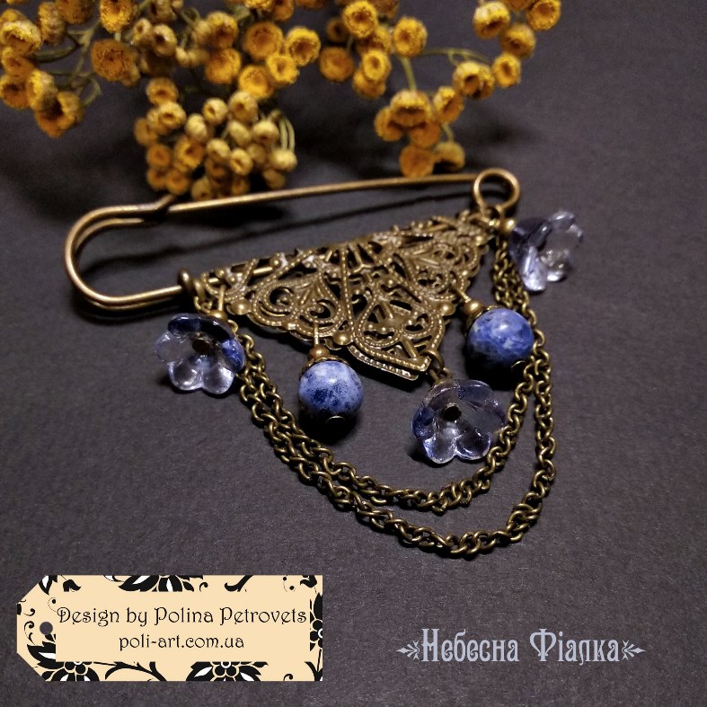 Матеріали: намистини ручної роботи (Lampwork - муранське скло), а також намистини натурального каміння Содаліту , основа броші - металева застібка та фурнітура - біжутерний сплав бронзового кольору.