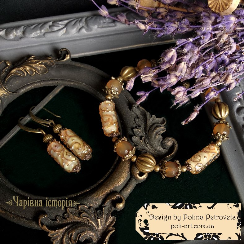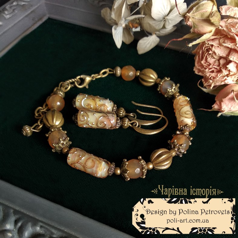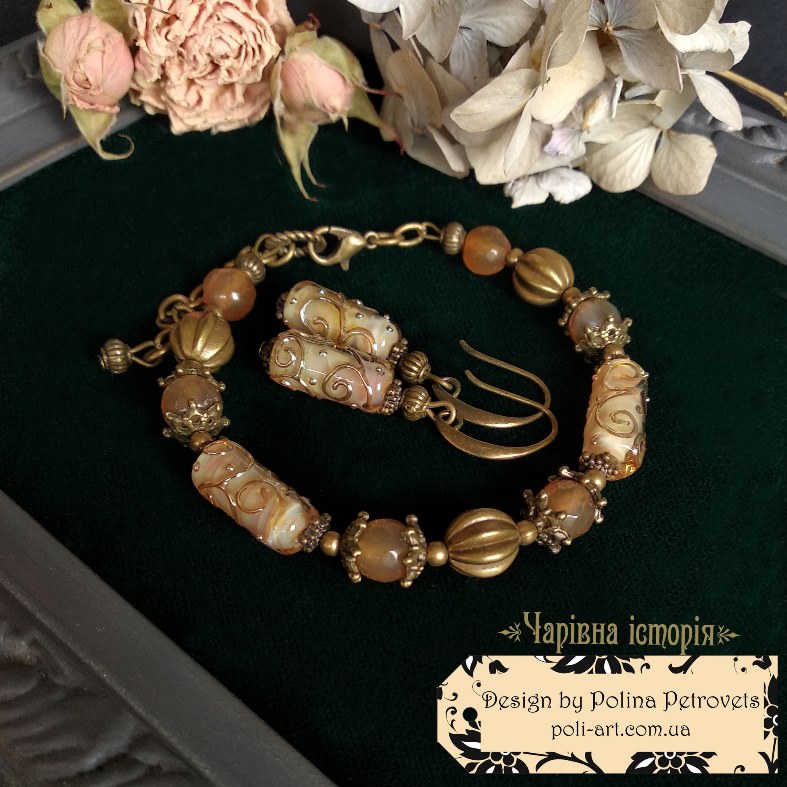 Introduction » За видами подарунків / виробів » Авторські прикраси » Комплект браслет і сережки з агатом та лемпворком "Чарівна Історія"