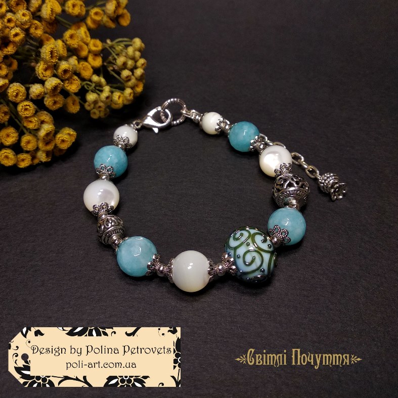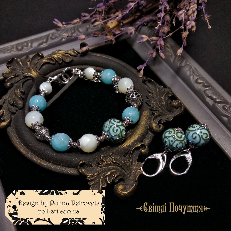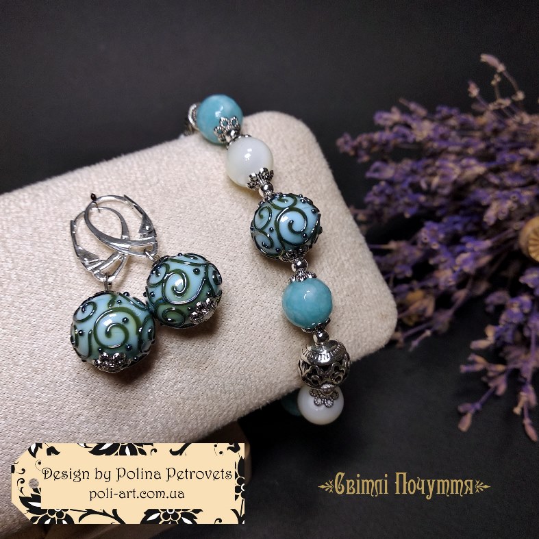 Introduction » За видами подарунків / виробів » Авторські прикраси » Комплект браслет і сережки з аквамарином, баламутами та лемпворком "Світлі Почуття"