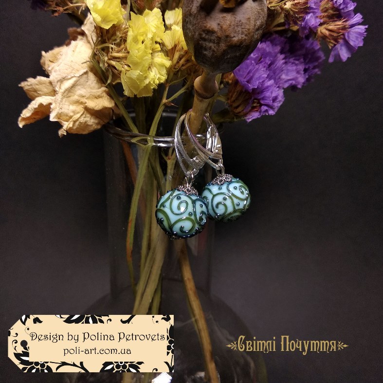 Матеріали: намистини натурального каміння Аквамарину і Баламутів, намистини Лемпворк - муранське скло ручної роботи, а також металеві намистини, обіймачі та фурнітура срібного кольору - біжутерний сплав, швензи (вушка сережок) - метал срібного тону медичного призначення.