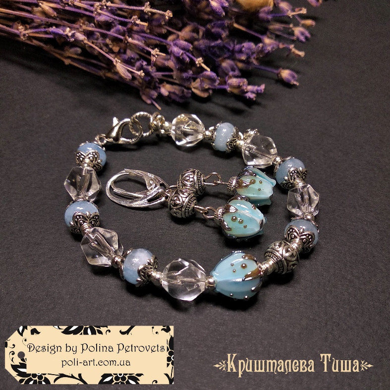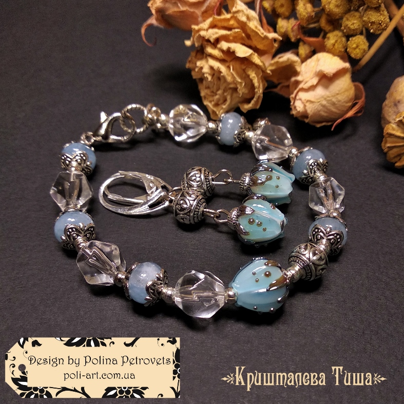 Introduction » За видами подарунків / виробів » Авторські прикраси » Комплект браслет і сережки з аквамарином, гірським кришталем та лемпворком "Кришталева Тиша"