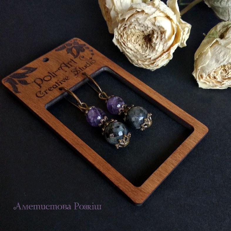 Матеріали: намистини натурального каміння Аметисту та Лабрадору, а також металеві намистини та фурнітура бронзового кольору - біжутерний сплав.