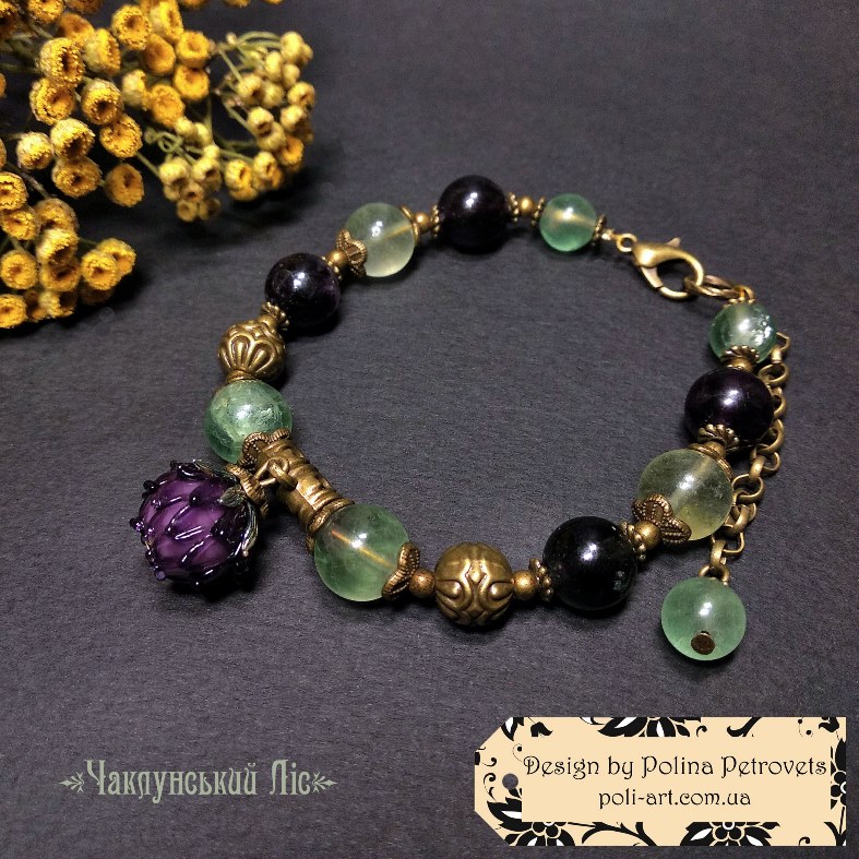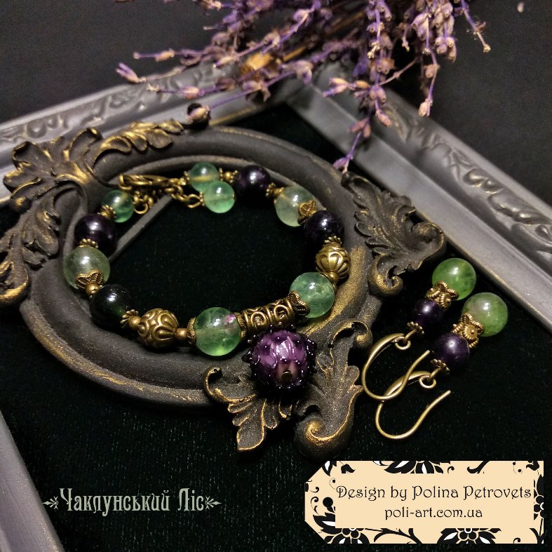 Introduction » За видами подарунків / виробів » Авторські прикраси » Комплект браслет і сережки з флюоритом та лемпворком "Чаклунський Ліс"