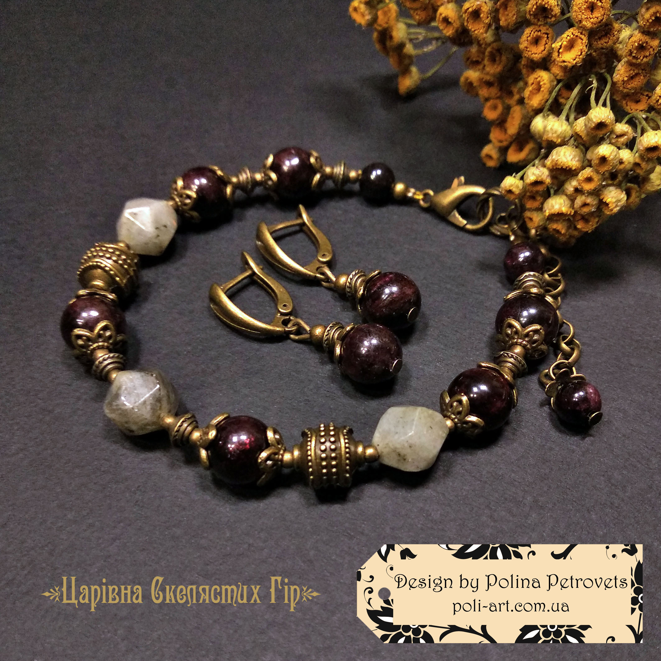 Introduction » За видами подарунків / виробів » Авторські прикраси » Комплект браслет і сережки з гранатом і лабрадором "Царівна Скелястих Гір"