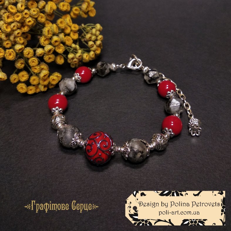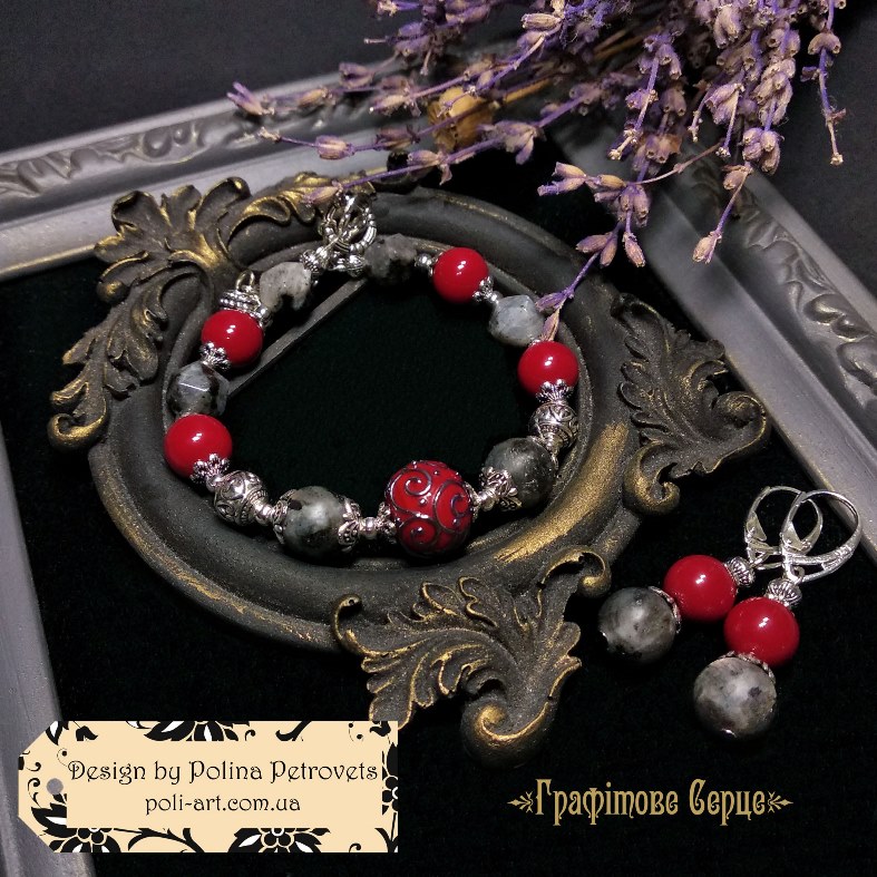 Introduction » За видами подарунків / виробів » Авторські прикраси » Комплект браслет і сережки з лабрадоритом та лемпворком "Графітове Серце"