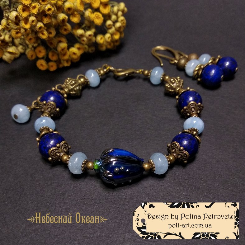 Introduction » За видами подарунків / виробів » Авторські прикраси » Комплект браслет і сережки з лазуритом, аквамарином і лемпворком "Небесний Океан"