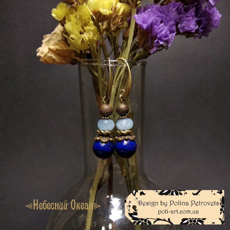 Матеріали: намистини натурального каміння Лазуриту і Аквамарину, центральна намистина - Лемпворку (муранське скло ручної роботи), а також металеві намистини, обіймачі, швензи та фурнітура бронзового кольору - біжутерний сплав.