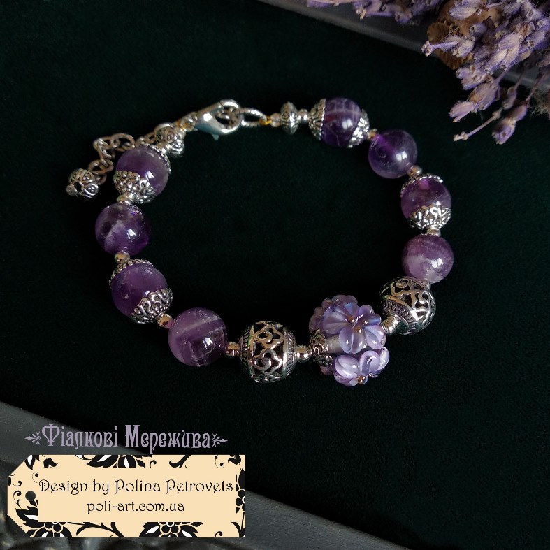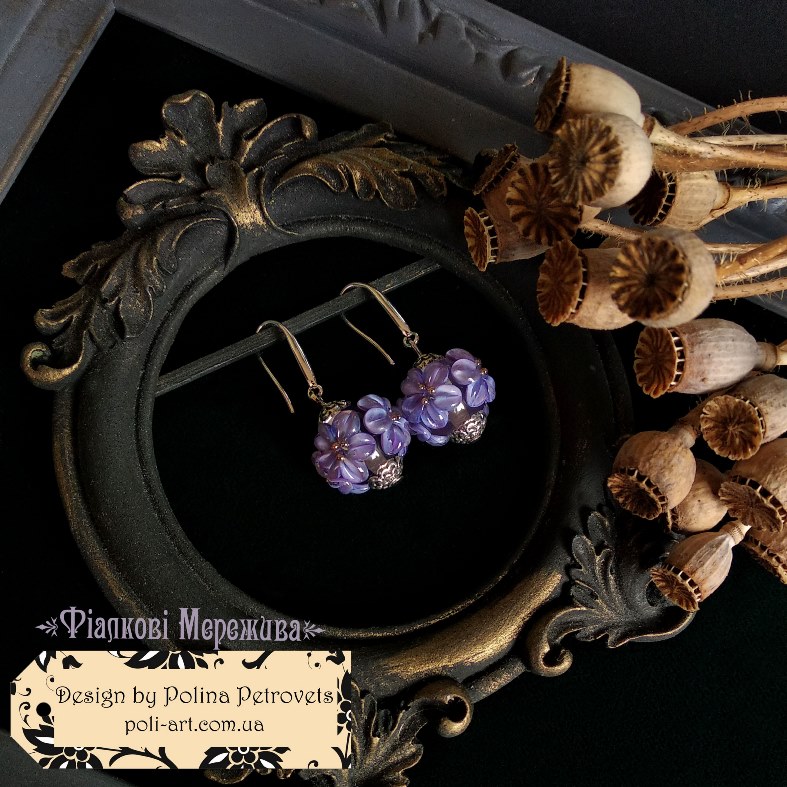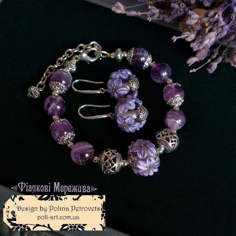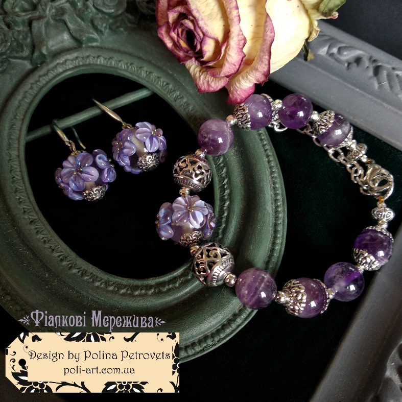 Introduction » За видами подарунків / виробів » Авторські прикраси » Комплект браслет і сережки з лемпворком "Фіалкові Мережива""