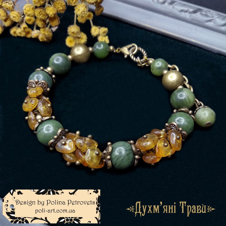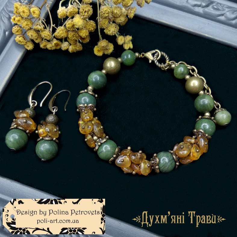 Introduction » За видами подарунків / виробів » Авторські прикраси » Комплект браслет і сережки з нефритом та зел. бурштином "Духм'яні Трави"