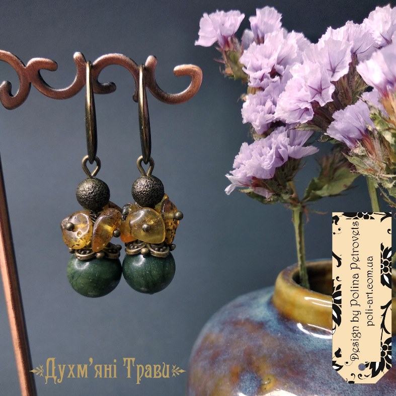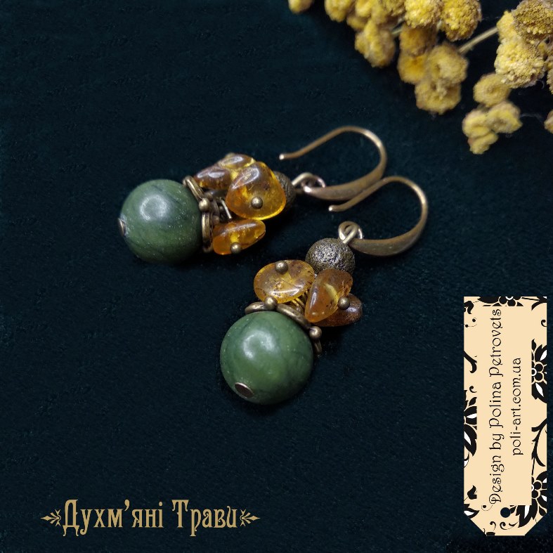 Матеріали: намистини натурального каміння Нефриту та зеленого Бурштину, а також металеві намистини, швензи та фурнітура бронзового кольору - біжутерний сплав.