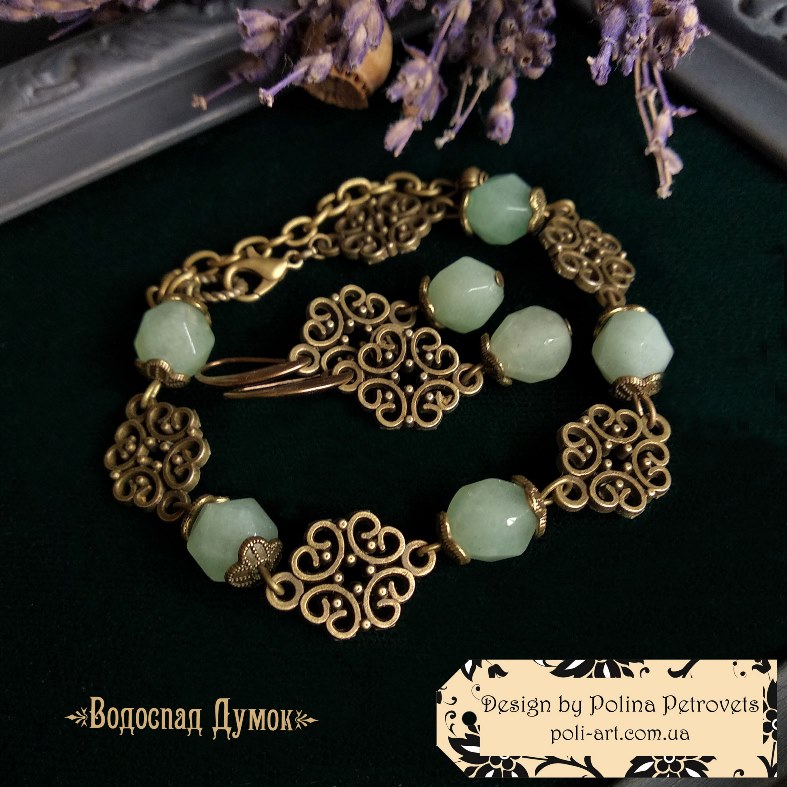 Introduction » За видами подарунків / виробів » Авторські прикраси » Комплект браслет і сережки з нефриту "Водоспад Думок"