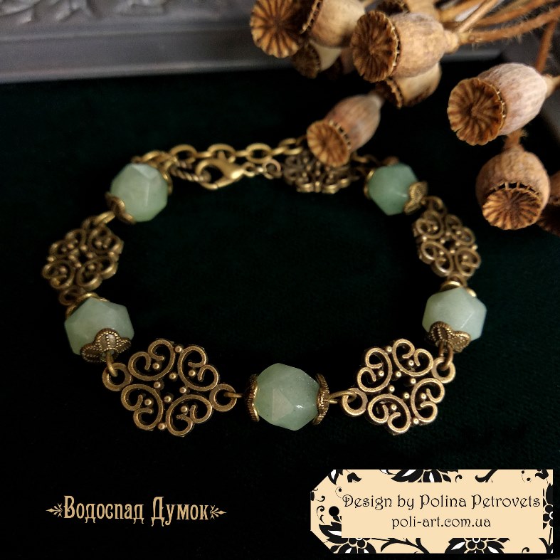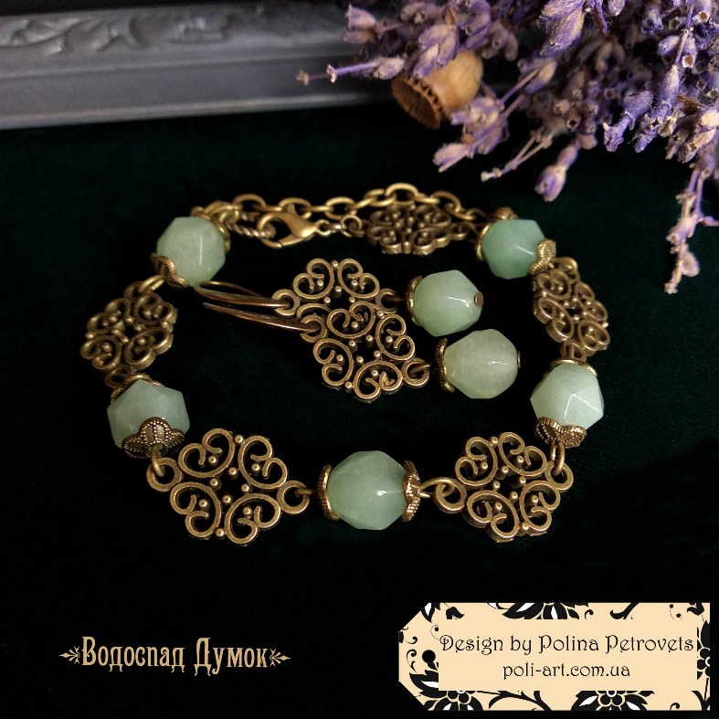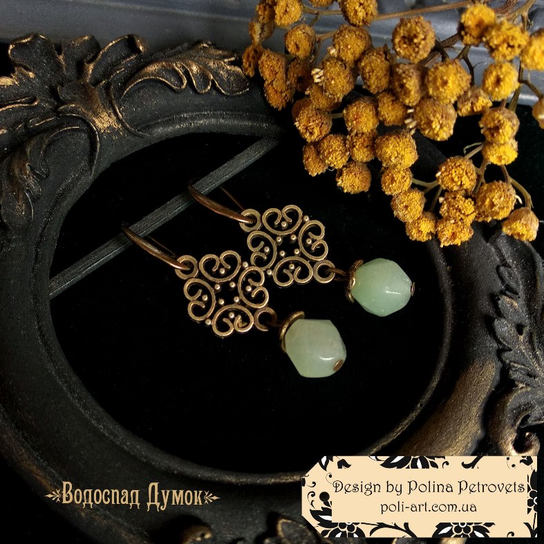 Матеріали: намистини натурального каміння Нефриту, а також швензи, металеві намистини та фурнітура бронзового кольору - біжутерний сплав.