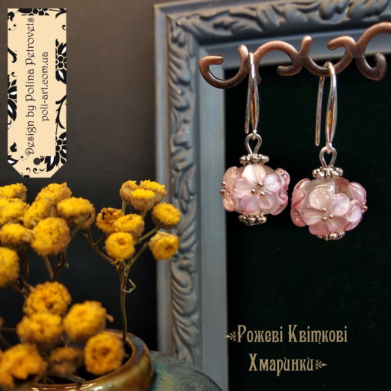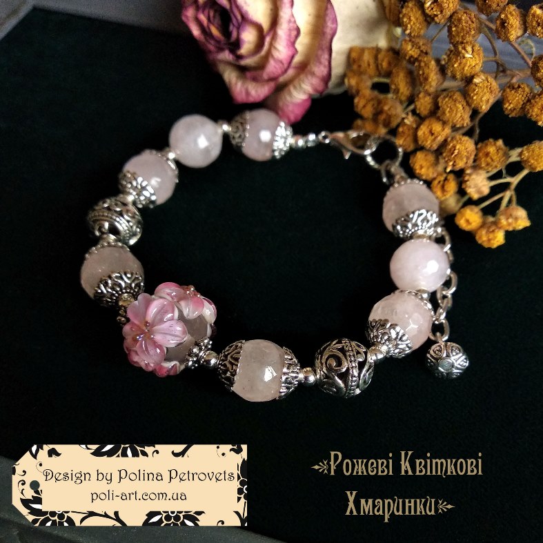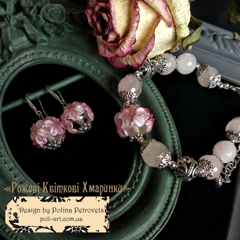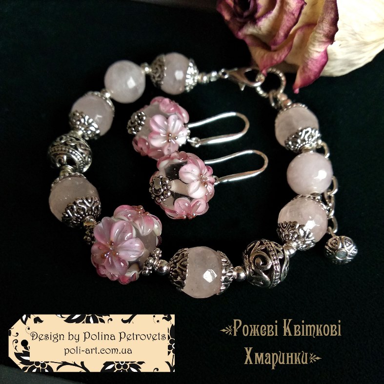 Introduction » За видами подарунків / виробів » Авторські прикраси » Комплект браслет і сережки з рожевим кварцем та лемпворком "Рожеві Квіткові Хмаринки"