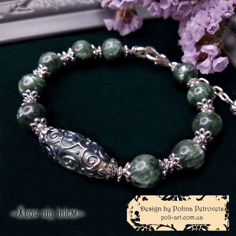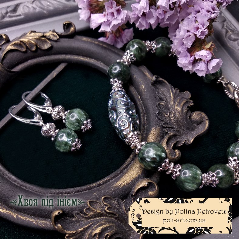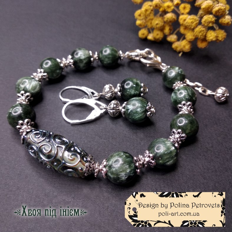 Introduction » За видами подарунків / виробів » Авторські прикраси » Комплект браслет і сережки з серафінітом і лемпворком "Хвоя під Інієм"