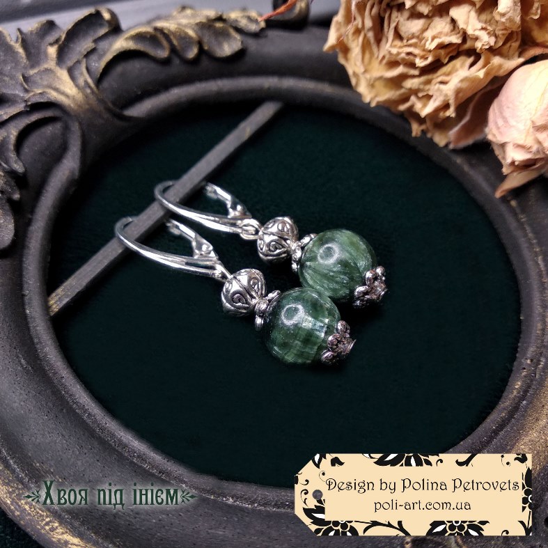 Матеріали: намистини натурального каміння Серафініту, центральна намистина Лемпворк - муранське скло ручної роботи, а також металеві намистини, обіймачі та фурнітура срібного кольору - біжутерний сплав, швензи (вушка сережок) - метал срібного тону медичного призначення.