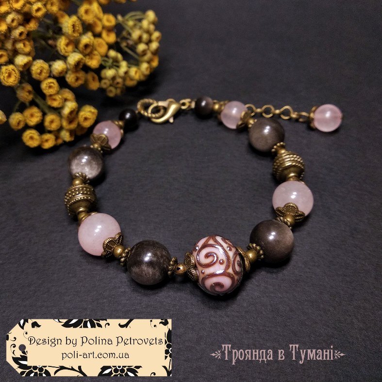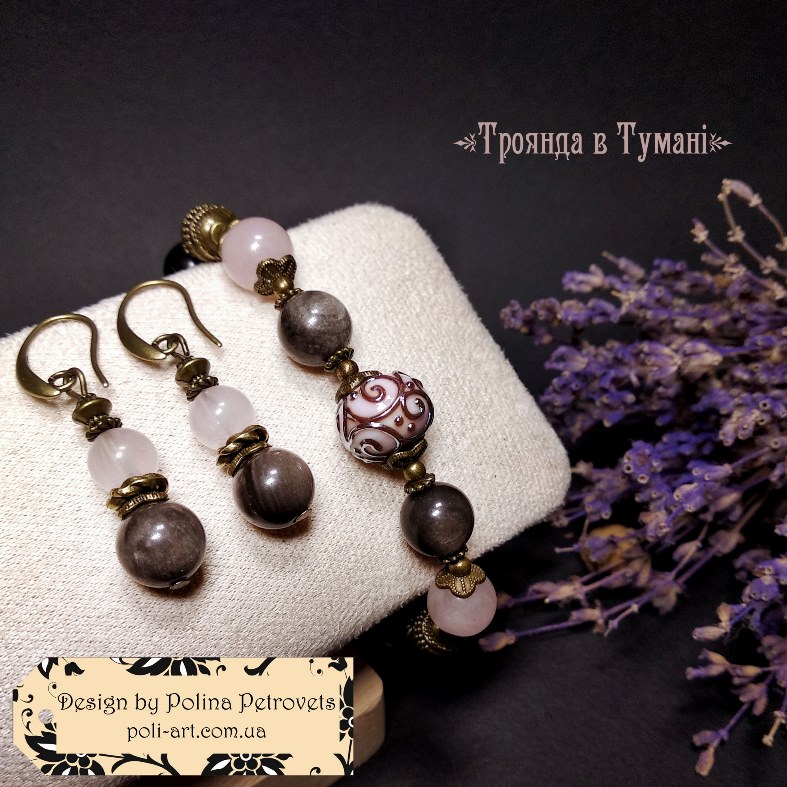 Introduction » За видами подарунків / виробів » Авторські прикраси » Комплект браслет і сережки з срібним обсидіаном, рожевим кварцем і лемпворком "Троянда в Тумані"