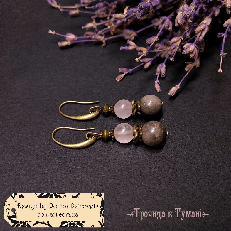 Матеріали: намистини натурального каміння срібного Обсидіану і рожевого Кварцу, центральна намистина - Лемпворку (муранське скло ручної роботи), а також металеві намистини, обіймачі, швензи та фурнітура бронзового кольору - біжутерний сплав.
