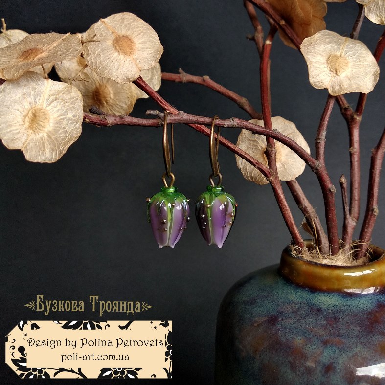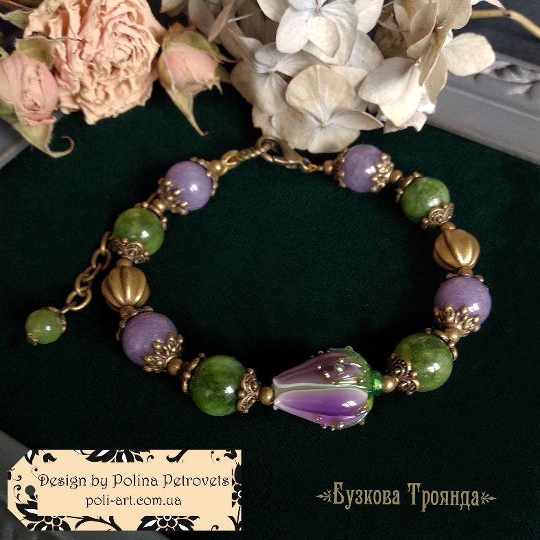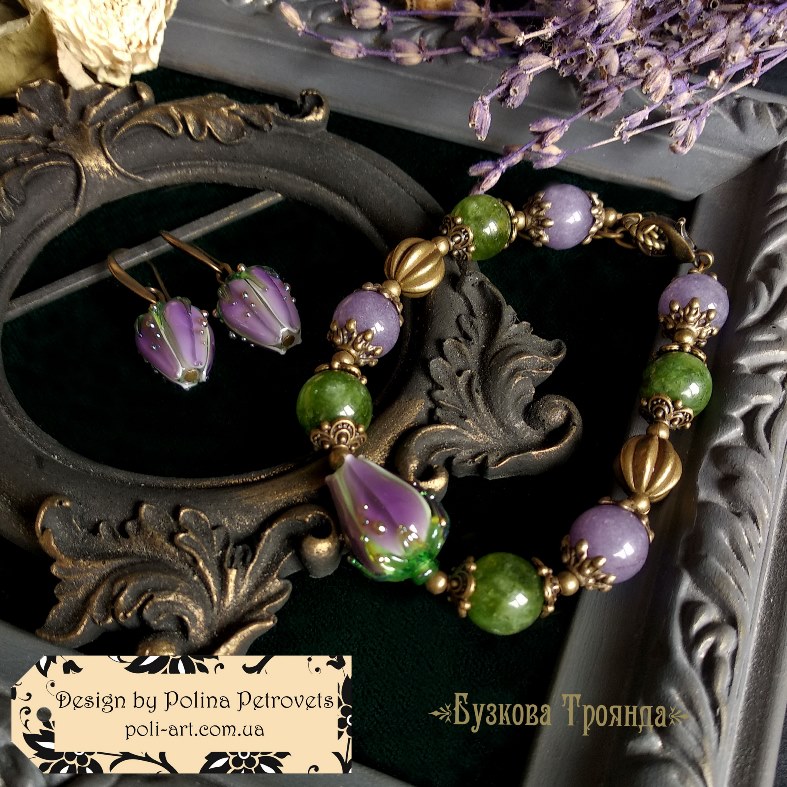 Introduction » За видами подарунків / виробів » Авторські прикраси » Комплект браслет і сережки з тон. аквамарином, жадеїтом та лемпворком "Бузкова Троянда"