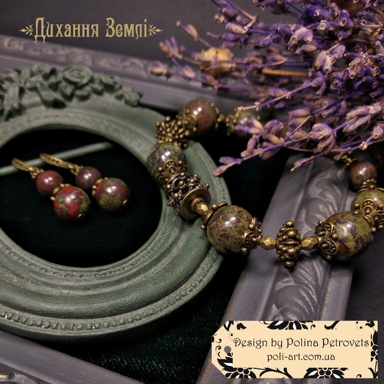 Матеріали: намистини натурального каміння Яшми - Кров Дракона, а також металеві намистини та фурнітура бронзового кольору - біжутерний сплав.