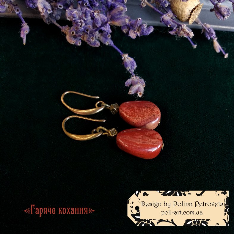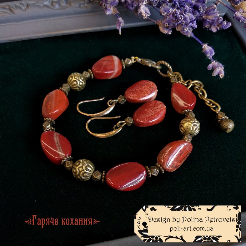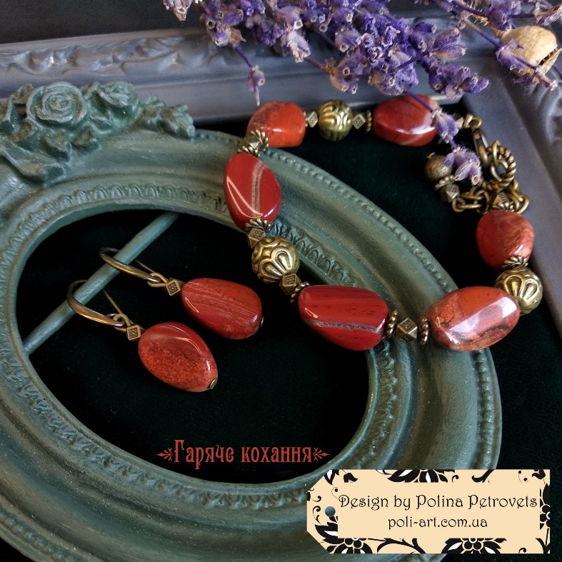 Introduction » За видами подарунків / виробів » Авторські прикраси » Комплект браслет і сережки з яшмою "Горяче кохання"
