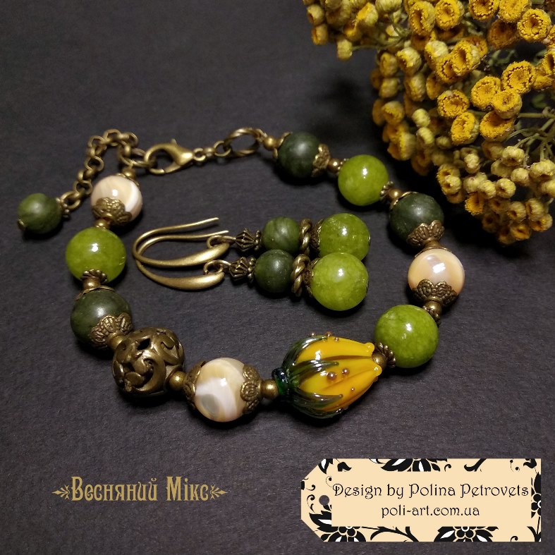 Introduction » За видами подарунків / виробів » Авторські прикраси » Комплект браслет і сережки з жадом, нефритом, баламутами і лемпворком "Весняний Мікс"