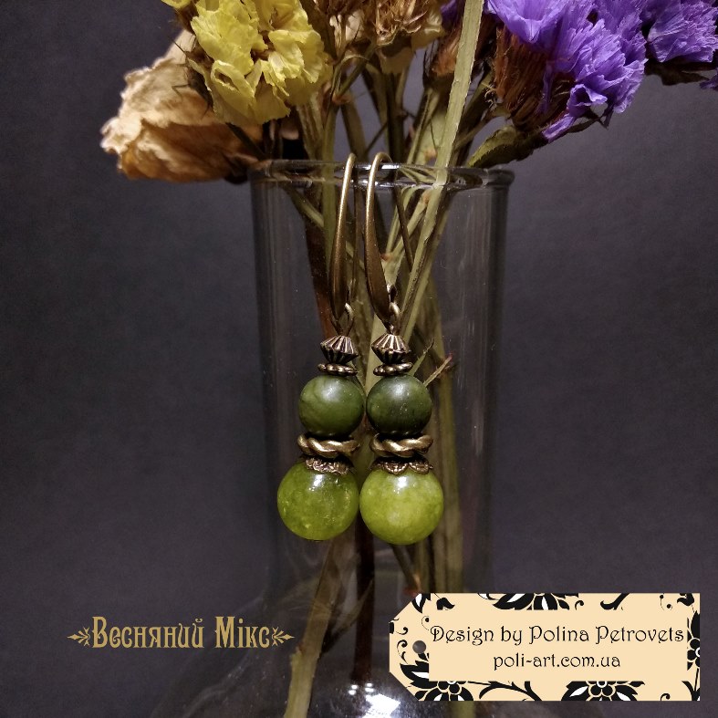 Матеріали: намистини натурального каміння Жаду, Нефриту і Баламутами, центральна намистина - Лемпворку (муранське скло ручної роботи), а також металеві намистини, обіймачі, швензи та фурнітура бронзового кольору - біжутерний сплав.