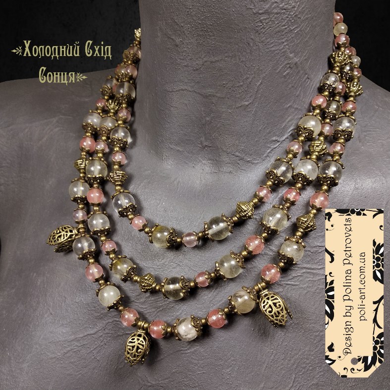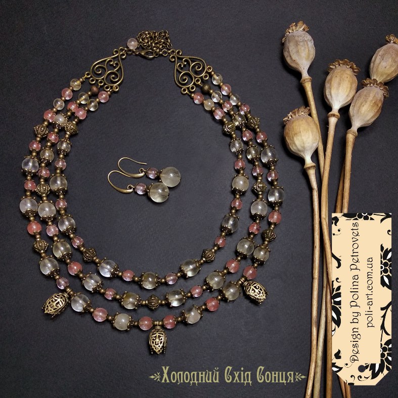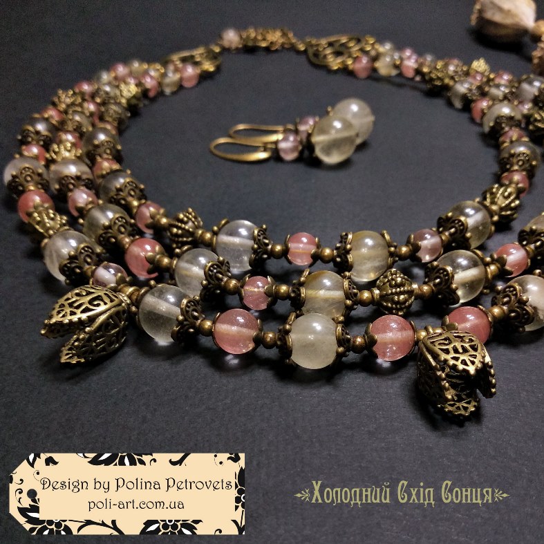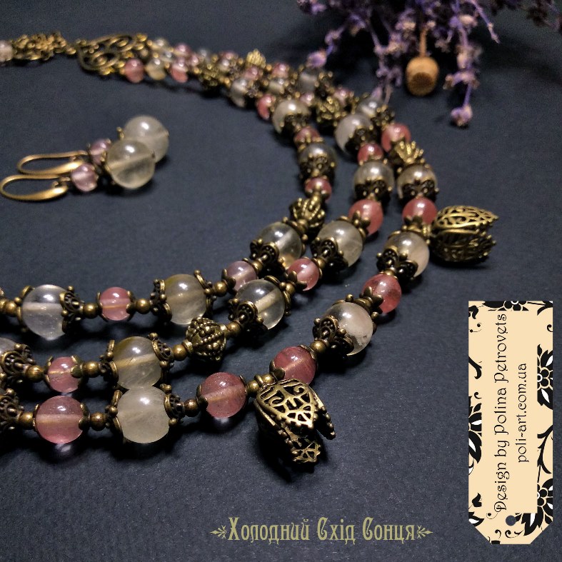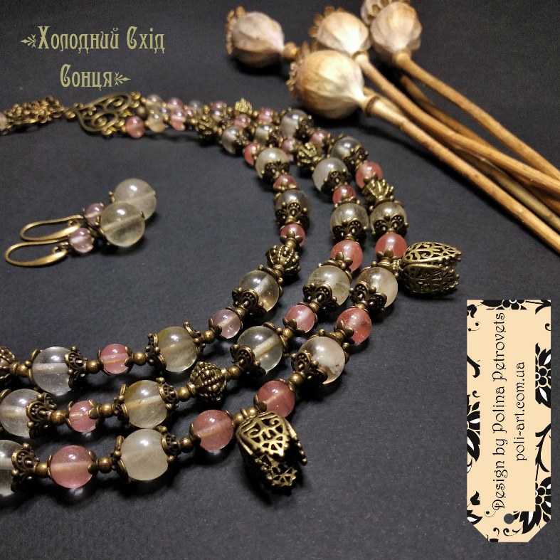 Introduction » За видами подарунків / виробів » Авторські прикраси » Комплект намисто і сережки з 2-х видів кварців і підвісами "Холодний Схід Сонця" (new)