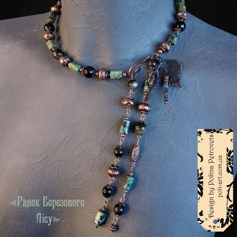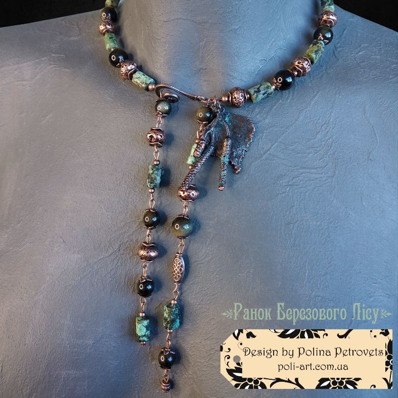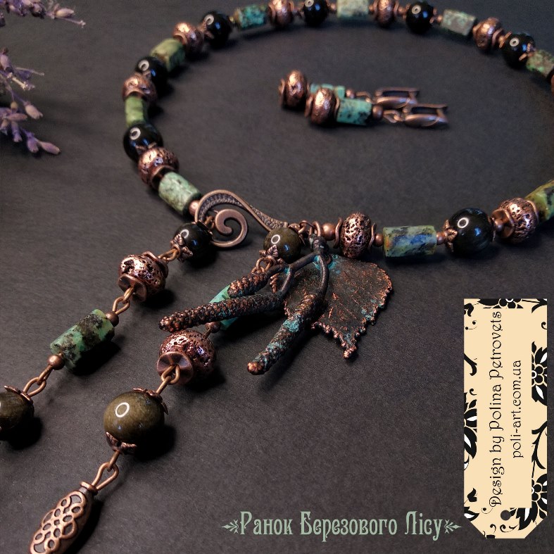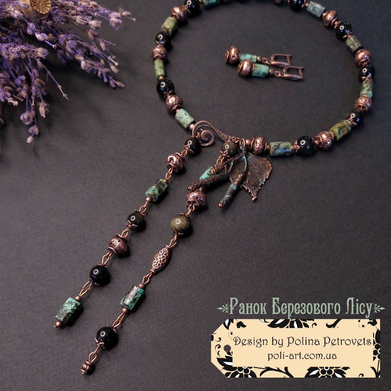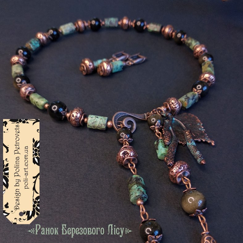 Introduction » За видами подарунків / виробів » Авторські прикраси » Комплект намисто і сережки з африканською бірюзою, золот. обсидіаном і гальв. лавою та гальв. листочок берези і сережки "Ранок Березового Лісу"
