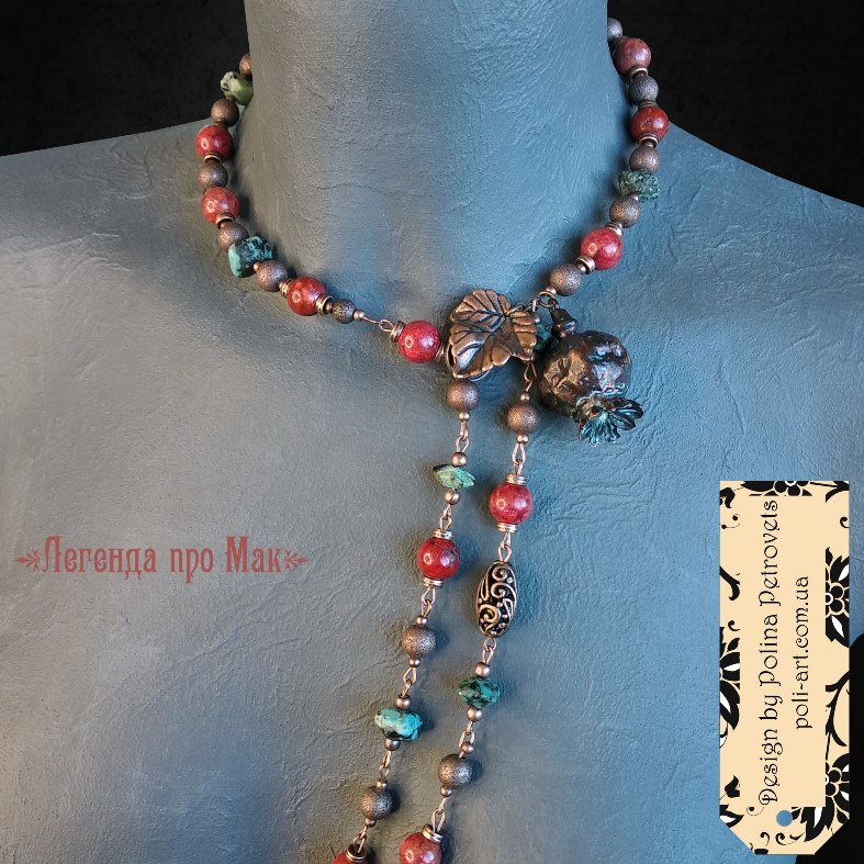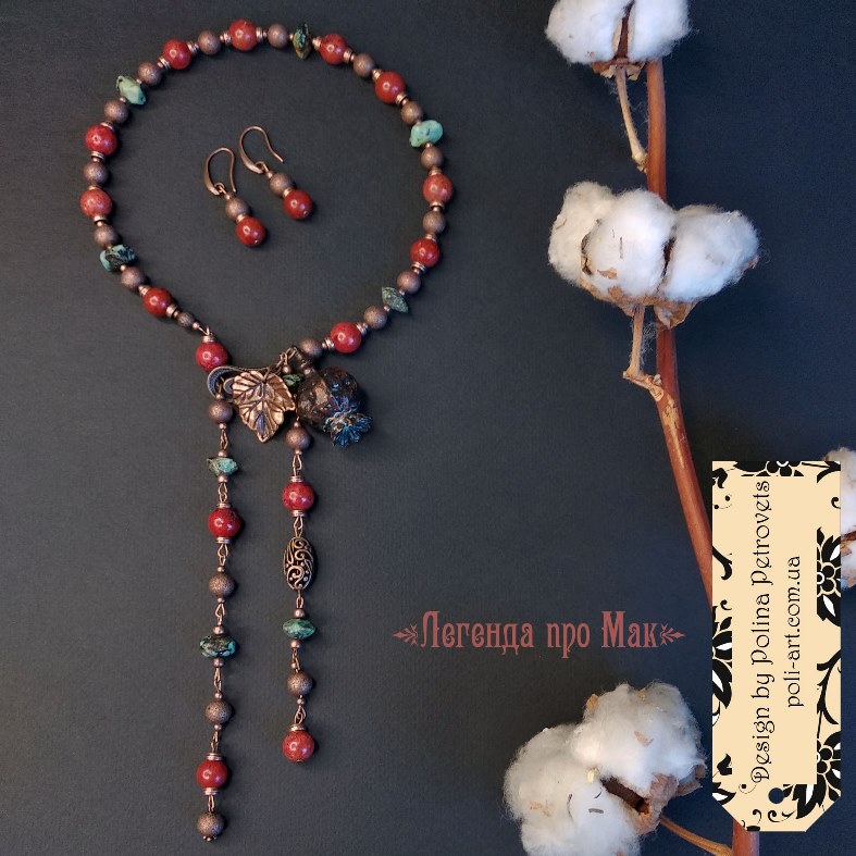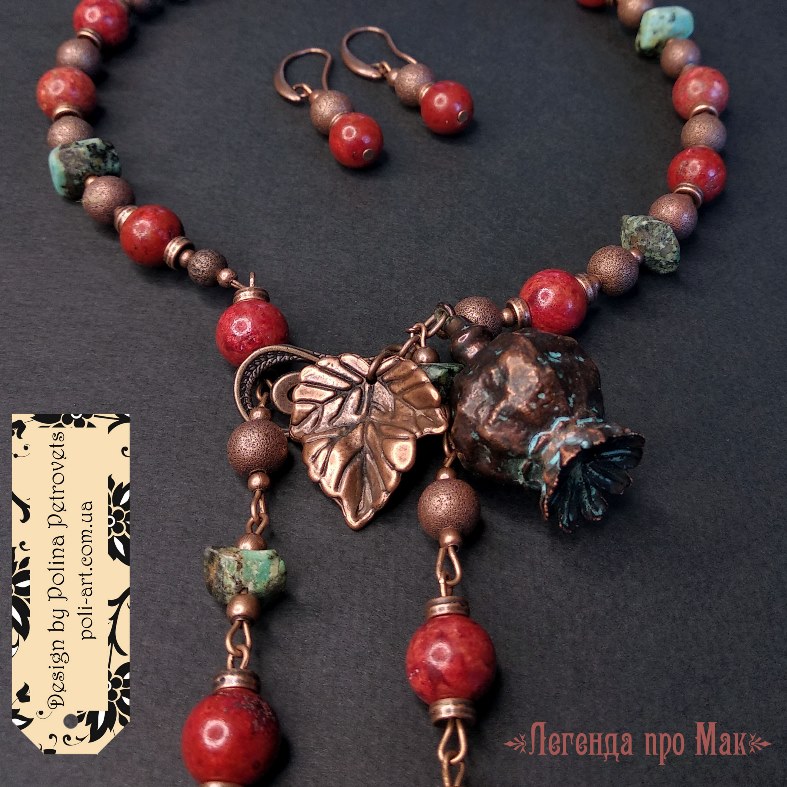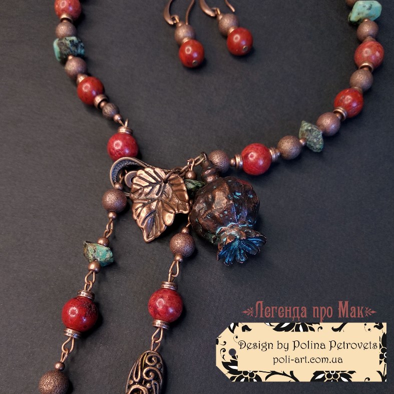Introduction » За видами подарунків / виробів » Авторські прикраси » Комплект намисто і сережки з губчастим коралом, африканської бірюзи та гальв. маковою коробочкою "Легенда про Мак"