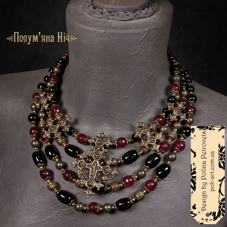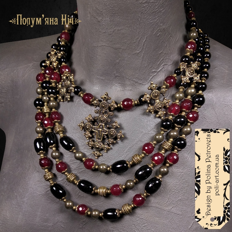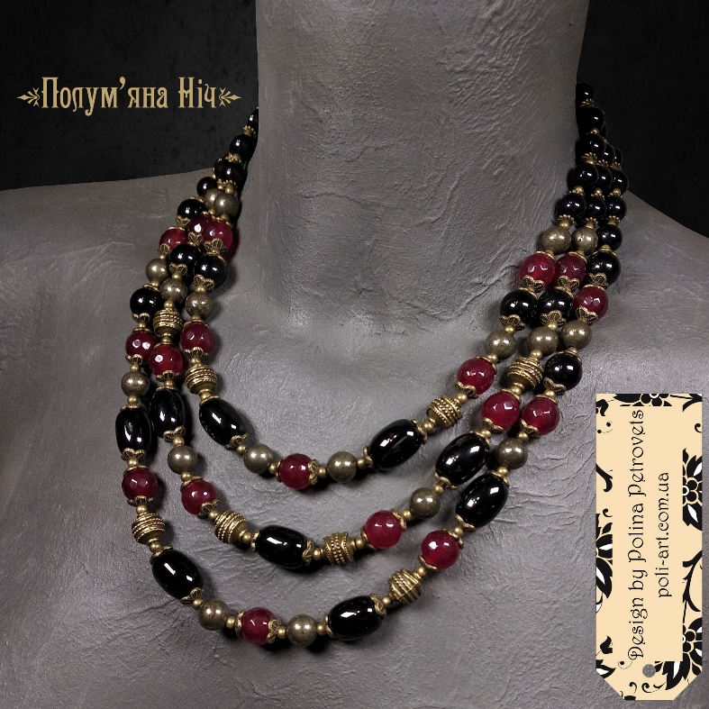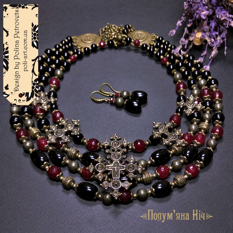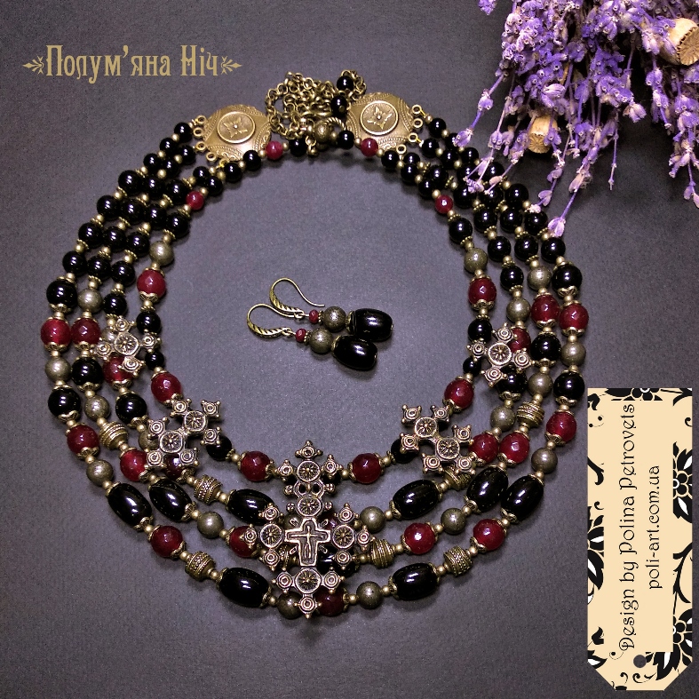 Introduction » За видами подарунків / виробів » Авторські прикраси » Комплект з 2-х намист і сережок з агатів, піриту і кварцу та підвісами (згарди) "Полум'яна Ніч"