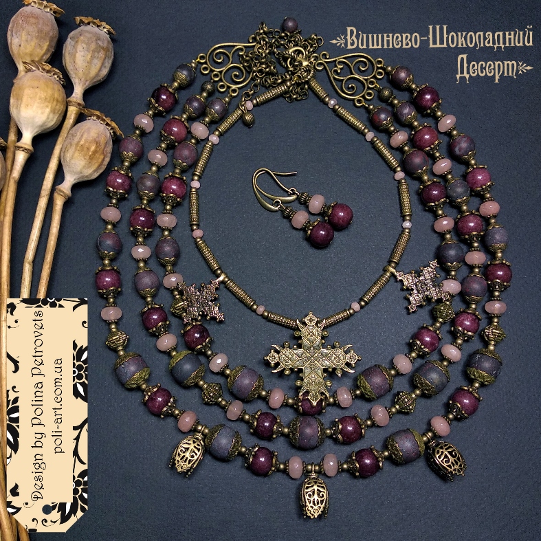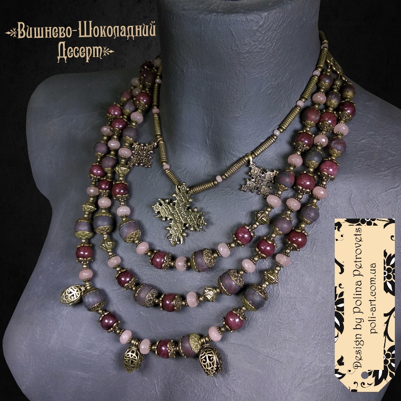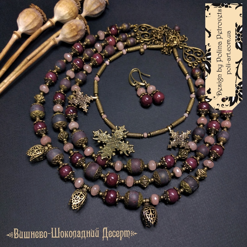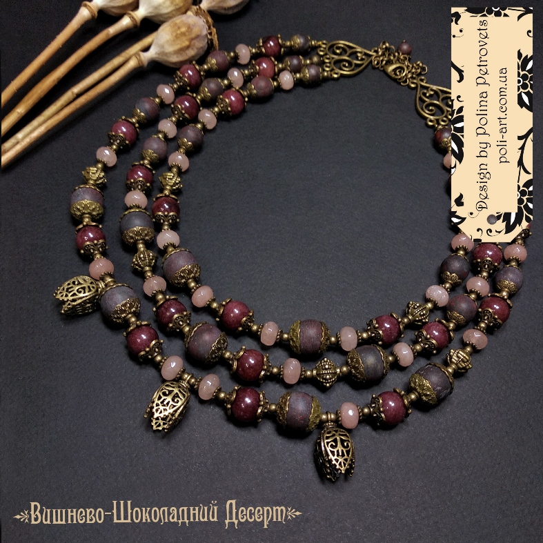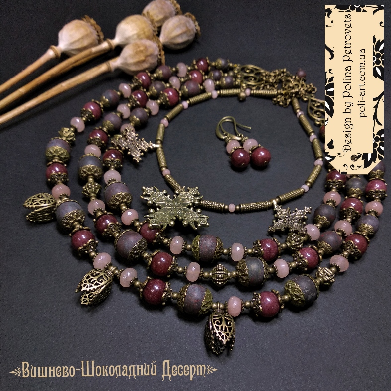 Introduction » За видами подарунків / виробів » Авторські прикраси » Комплект з 2-х намист і сережок з винним гранатом, яшмою і кварцем та підвісами (згардами і тюльпанами) "Вишнево-Шоколадний Десерт"