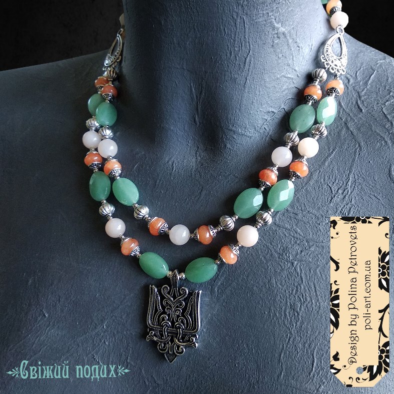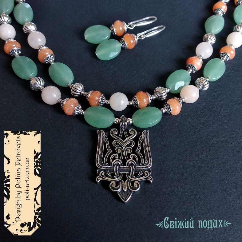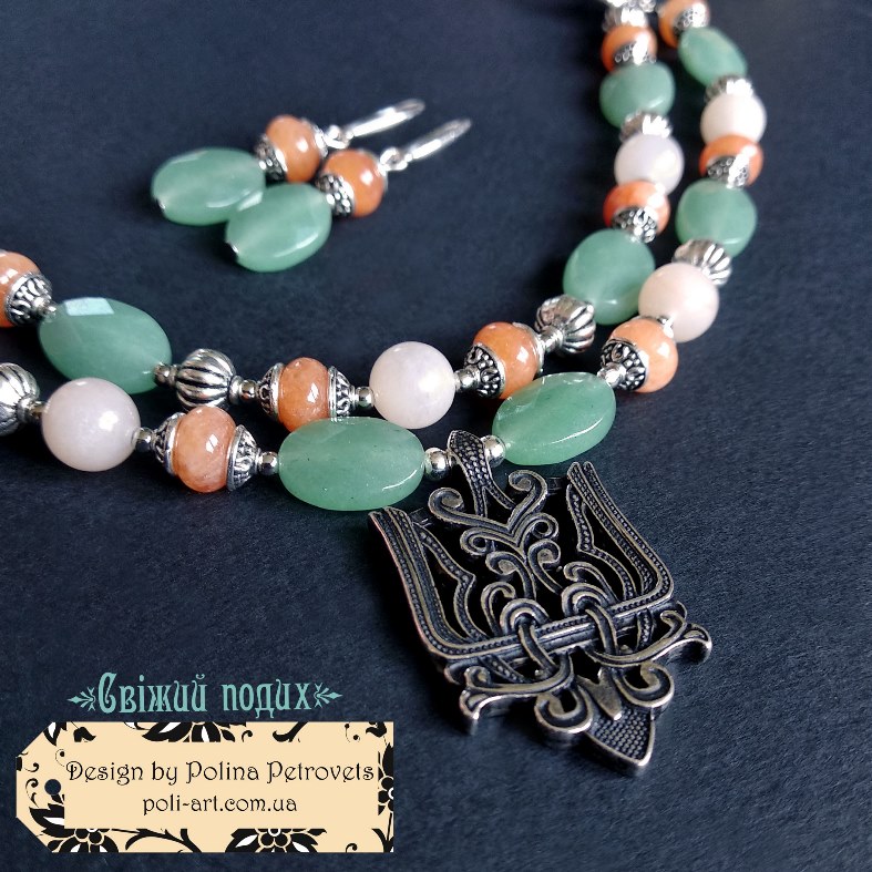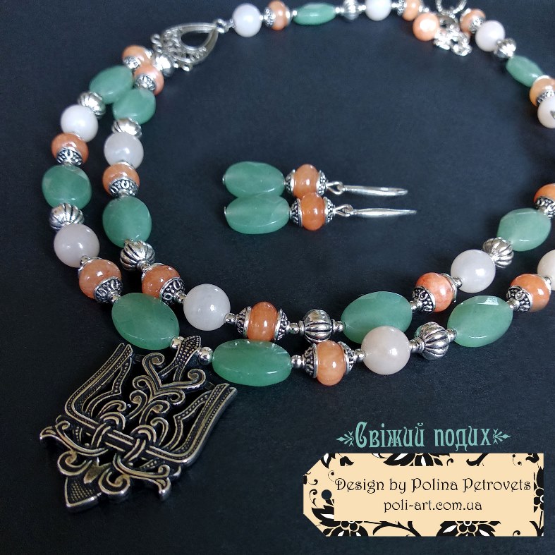 Матеріали: намистини натурального каміння Авантюрину, Кварцу і Нефриту, а також металева фурнітура(намистини, обіймачі, поєднувачі і застібка) срібного кольору - біжутерний сплав, підвіс (тризуб) - авторське литво.