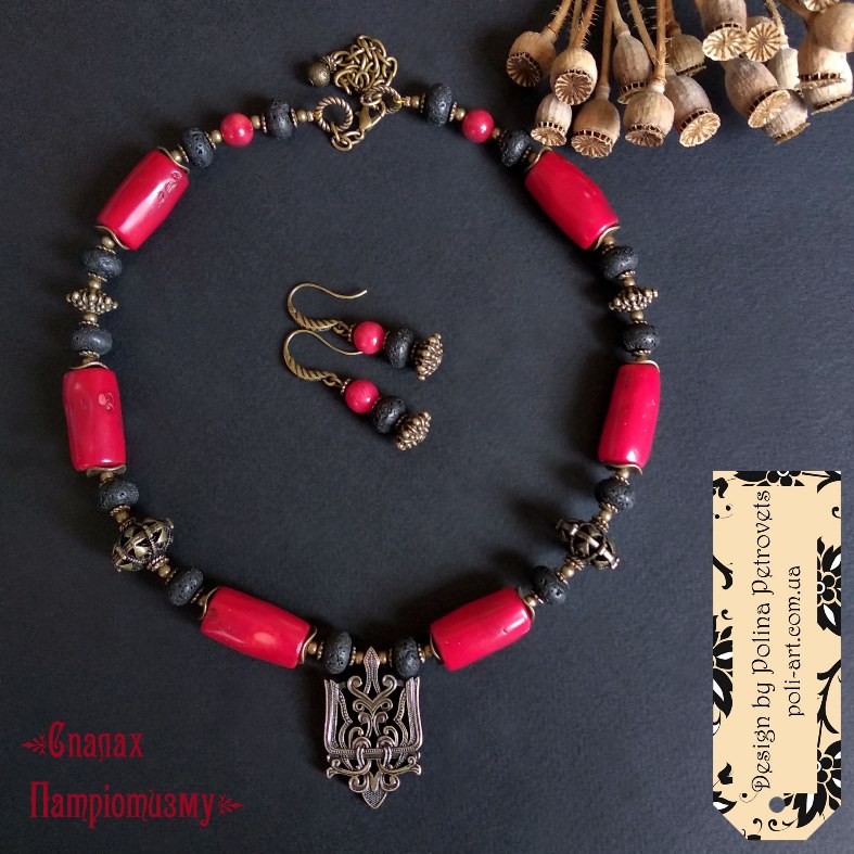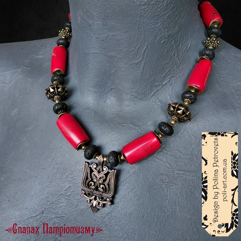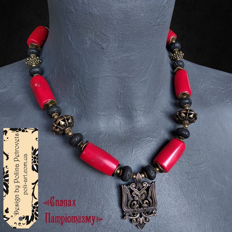 Класика коралів з додаванням невеликих вкраплень лави + неймовірний підвіс Тризуб і все це в обрамленні гарної фурнітури кольору бронзи!