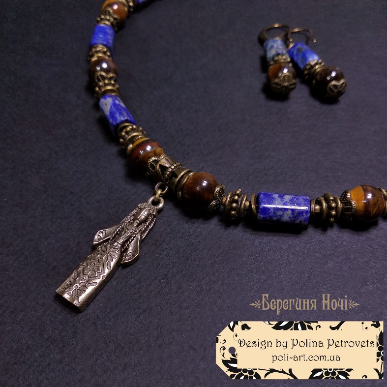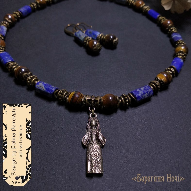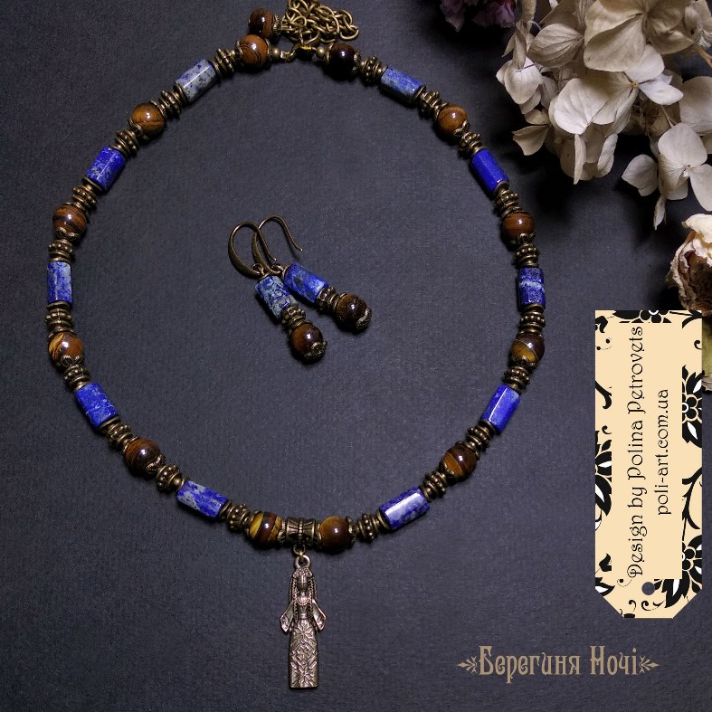 Introduction » За видами подарунків / виробів » Авторські прикраси » Комплект з намиста і сережок з лазуриту і тигрового ока та підвісом "Берегиня Ночі"