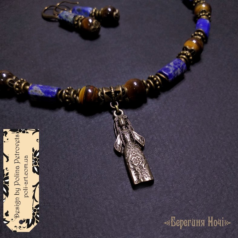 Комплект з намиста і сережок з лазуриту і тигрового ока та підвісом "Берегиня Ночі"