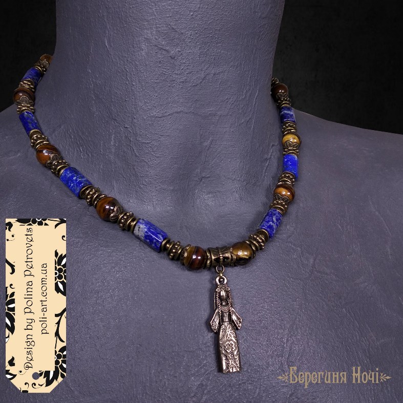 Матеріали: намистини натурального каміння Лазуриту і Тигрового Ока, а також фурнітура (намистини, обіймачі, поєднувачі, швензи та застібка) бронзового кольору - біжутерний сплав, підвіс ("Мотанка") бронзового тону - біжутерний сплав.
