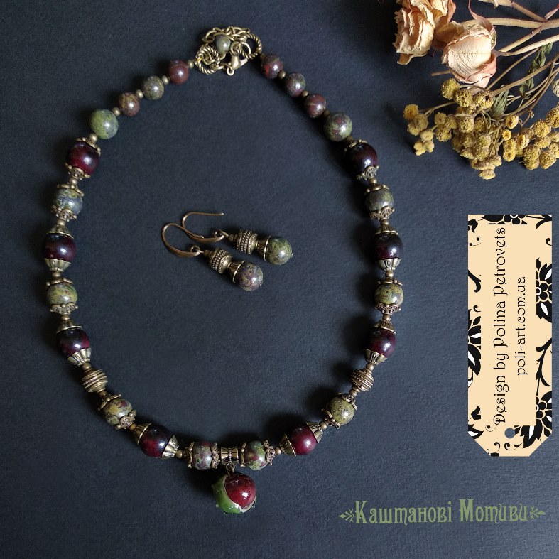 Introduction » За видами подарунків / виробів » Авторські прикраси » Комплект з намиста і сережок з яшмою і гранатом та підвісом з лемпворку "Каштанові Мотиви"