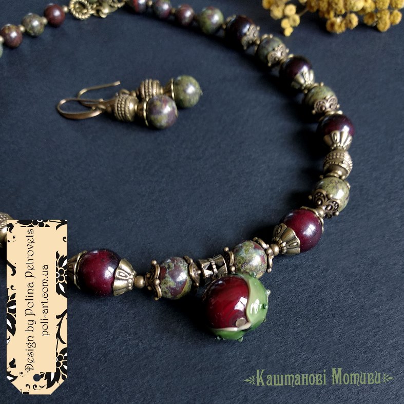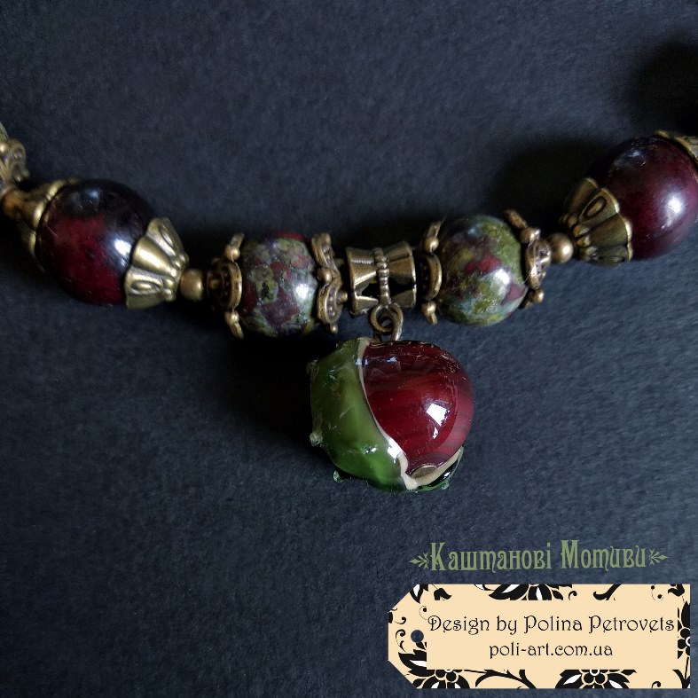 Матеріали: намистини натурального каміння Яшми ("Кров Дракону") і Гранату, а також фурнітура (намистини, обіймачі, поєднувачі, швензи та застібка) бронзового кольору - біжутерний сплав, підвіс з лемпворку ("Каштан") - муранське скло ручної роботи.