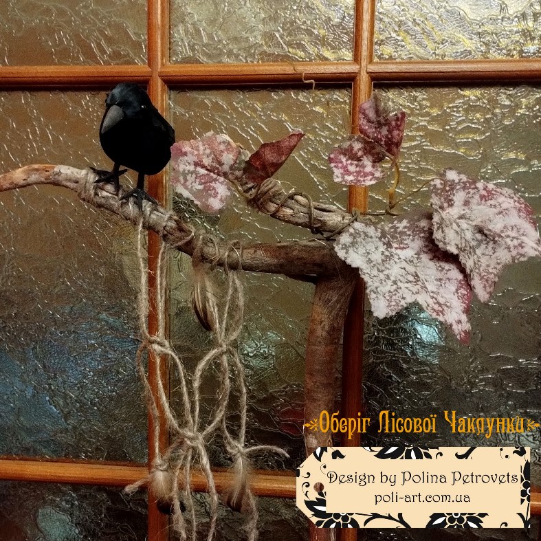 Матеріали: дерево, пруття берези, джут та джутове плетіння, квіти штучні з тканини, декоративні елементи, акрилова фарба та стрічка, а також LED-вогник у вигляді ліхтарика.